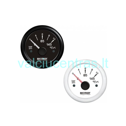RECMAR tepalo spaudimo skydelis. Esant mažam tepalo spaudimui reikia atkreipti dėmesį į tepalo lygį, tinkamumą naudojimui ir ar nėra perkaitimo sistemoje. Sugraduota nuo 0 iki 10 BAR. Nerasojantis, su nerūdijančio plieno lankeliu, naktiniu apšvietimu,