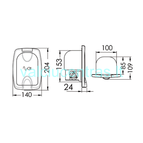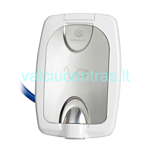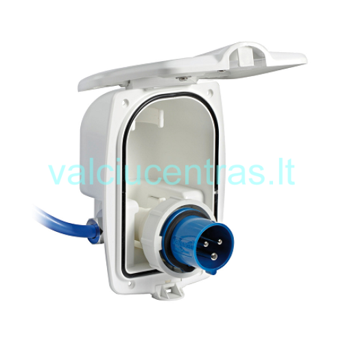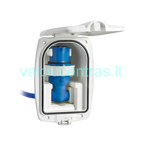 Hermeriškas kištukas. Įmontuojama dėžutė pagaminta iš tvirto, kokybiško plastiko, o priekinis dangtelis iš poliruoto nerūdijančio plieno.