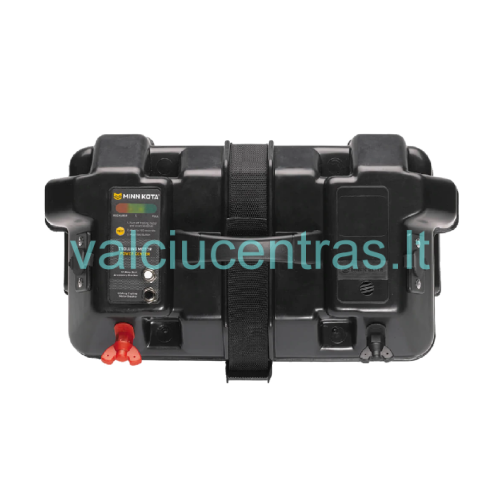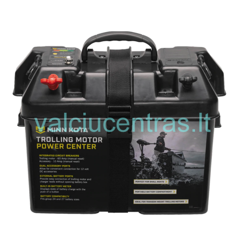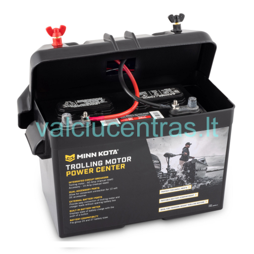 Originali Minn Kota dėžė akumuliatoriui. Tinka naudoti valtyse. Nereikia atidaryti dangčio, dėžės išorėje sumontuoti gnybtai leis greitai prijungti elektrinį variklį. Integruotas dėžėje indikatorius rodo baterijos įkrovimo būseną. Dėžėje taip pat sumontuota dvi 12V rozetės, ir 2 saugikliai - 10A priedams ir 60A elektriniam varikliui.