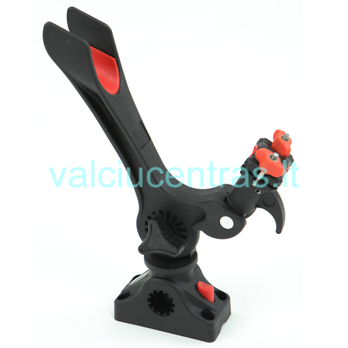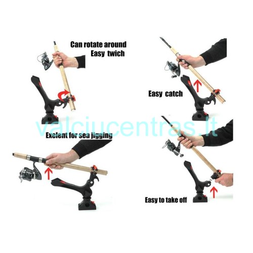 Atlenkiamas meškerės laikiklis su užraktu. Gali būti tvirtinamas horizontalioje ir vertikalioje padėtyje, lengvai nuimamas. Reguliuojamas pasukimo, pakrypimo kampas. Laikiklis yra atlenkiamas, taigi velkiaujant galėsite staigiai "pakirsti" žuvį, gali būti judinamas į šonus, priekį ir atgal - nenuėmus meškerės.