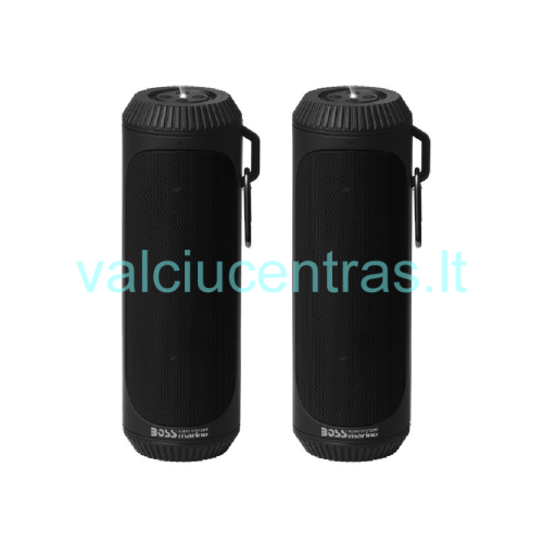 Garso kolonėlės BOSS AUDIO SYSTEMS BOLTBLK. Nešiojamos, lengvos, tinka naudoti valtyje, baseine, ir kitoje drėgnoje aplinkoje, atsparios lietui. Suderinama su išmaniuoju telefonu, planšetiniais kompiuteriais ir bet kuriuo įrenginiu, kuris turi Bluetooth ryšį.