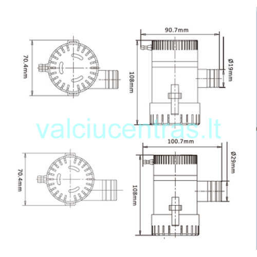 - 750 GPH - 50l/min, aukštis 107 mm, žarnos diametras 19mm, 2.5A