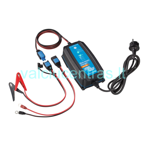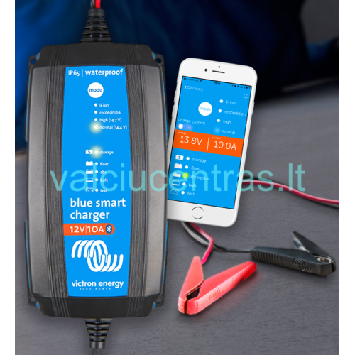 Blue Smart IP65 automatinis įkroviklis su integruota BLUETOOTH sistema, su kurios pagalba stebėti akumuliatoriaus įkrovimo lygį bei rėžimą galima išmaniajame telefone (reikalinga VictronConnect programa). Universalus įkroviklis tinkantis automobilų bei laivų akumuliatoriams. Įkrovimas vyksta 7-iais lygiais kurie padeda akumuliatorių lengviau pakrauti, palaikyti reikalingą rėžimą, bei užtikrina ilgą tarnavimą. Vandeniui atsparūs Blue Smart įkrovikliai turi du lengvai pakeičiamus antgalius, atitinkančius bet kokio tipo akumuliatorių.