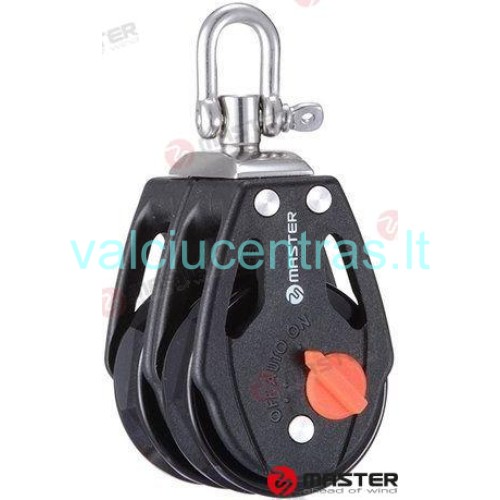 Master dvigubas pasukamas blokas su šekeliu 57mmmm. Šoninė plokštelė pagaminta iš tvirto plastiko, šekelis ir guolis iš AISI 316 nerūdijančio plieno.