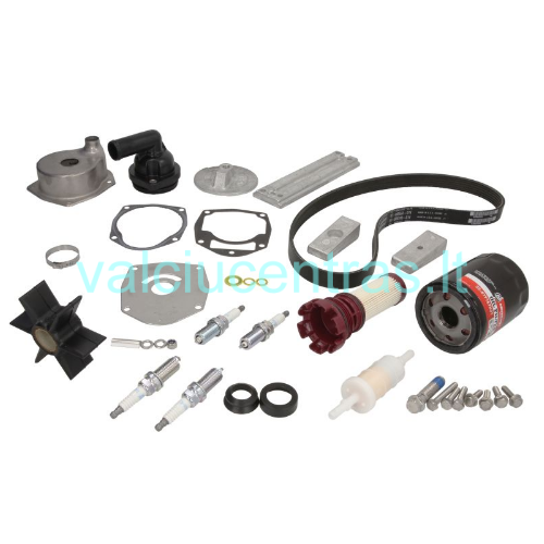 Komplektą sudaro: 2vnt. kuro filtrų, tepalo filtras, tarpinės, termostatas, žvakės, pavaros diržas, anodai, impelerio komplektas.