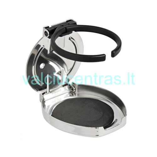 Puodelių, skardinių, butelių laikiklis. Pagamintas iš poliruoto nerūdijančio plieno ir tvirto plastiko.