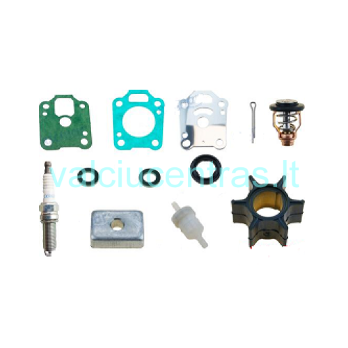 Komplektą sudaro: termostatas, impeleris, vandens pompos tarpinės, kaištis, karterio varžto tarpinėlė, reduktoriaus varžto tarpinėlė, kuro filtras, anodas, žvakė(DCPR6E)