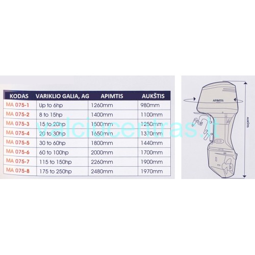 Dydžių lentelė (variklio galingumas, kojos ilgis):