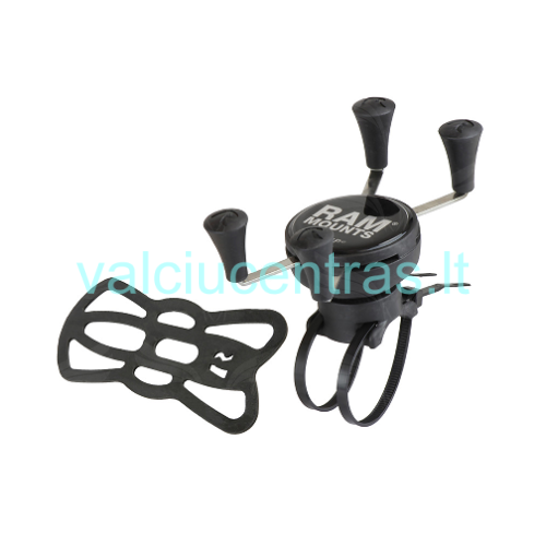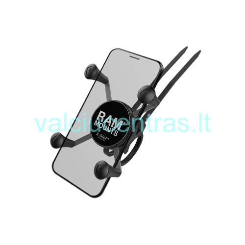 RAM išmaniojo telefono laikiklis su dvigubu dirželių pagrindu ir X-grip lopšiu.
