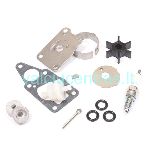 Rinkinį sudaro: Žvakė-CPR6EA-9, anodai, vandens aušinimo komplektas, kuro filtras, tarpinės, sraigto kaištis, impeleris, vandens siurblio rankovė.