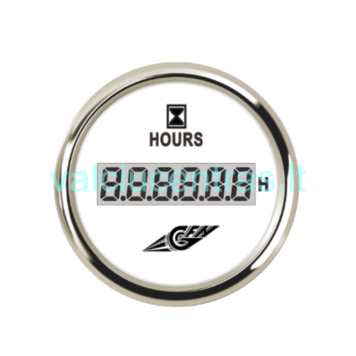 GFN moto valandų skaičiuoklė. Skydelyje skaičiuoja išdirbtas moto valandas. Nerasojantis, atsparus vandeniui, bei su naktiniu apšvietimu. Skydelis montuojamas valites / laivo / katerio konsolėse ar penelėse šalia kitų funkcijų skydelių.