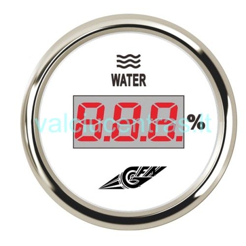 GFN skaitmeninis vandens lygio skydelis. Rodantis vandens lygĮ talpykloje procentais. Skydelis yra nerasojantis, vandeniui atsparus, su naktiniu apšvietimu bei nerūdijančio plieno lankeliu. Montuoti galima valties / laivo / katerio panelėje ar konsolėje.