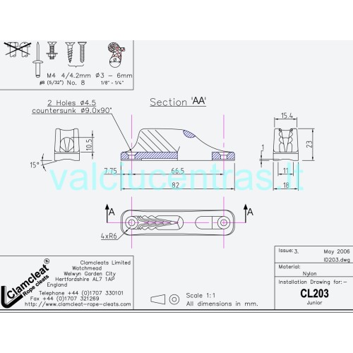 Virvės blokatorius, galimas virvės storis 3-6 mm, atstumas tarp skylių 66mm, skylės diametras 4mm.
