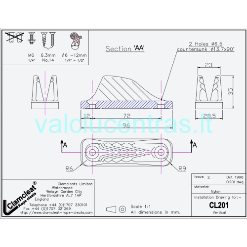 Virvės blokatorius, galimas virvės storis 6-12 mm, atstumas tarp skylių 72 mm, skylės diametras 6 mm.